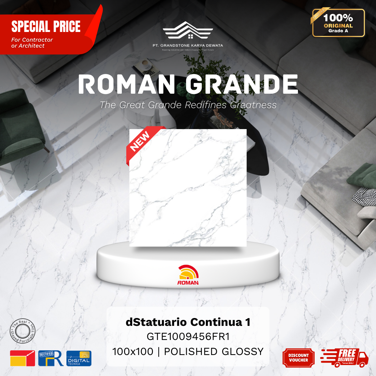 RomanGranit Grande mempersembahkan koleksi dengan desain statuario marmer putih khas Italia, yaitu dStatuario. Koleksi ini hadir dengan 2 pilihan, yaitu dStatuario Continua, yang urat-uratnya akan menyambung jika dipasang searah, dan dStatuario Specchio yang dapat membentuk pola bookmatch. dStatuario dengan desain marmer putih akan memberikan efek mewah dan minimalis sehingga koleksi ini cocok dipasang di interior ruangan sebagai finishing lantai hunian seperti ruang utama hingga ruang komersial dengan area yang luas seperti lobi hotel, mal, dll.