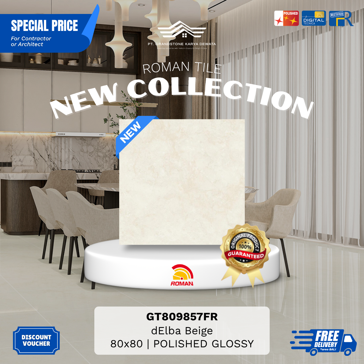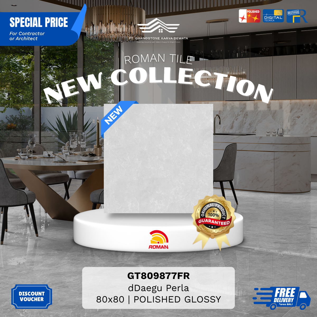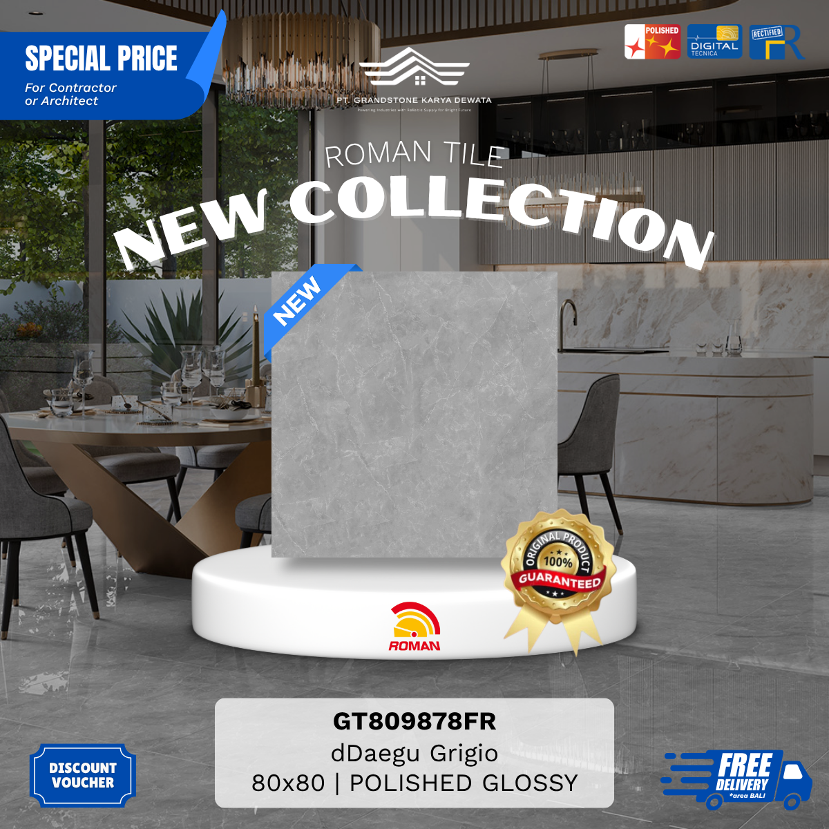 Produk unggulan Roman Granite XTRA Size telah hadir di BALI. Grandstone Karya Dewata siap menjadi mitra terbaik kamu untuk memilih motif sesuai keinginan, pembelian dengan harga murah, hingga project pemasangan oleh aplikator andal dan berkualitas.