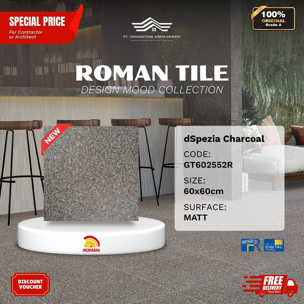 Produk unggulan Roman Granite Design Mood menghadirkan motif-motif yang elegan, keunggulannya pasti lebih tahan panas, tahan goresan, tahan chemical, dan tidak menyerap noda. Grandstone Karya Dewata siap menjadi mitra terbaik kamu untuk memilih motif sesuai keinginan, pembelian dengan harga kompetitif, hingga project pemasangan oleh aplikator andal dan berkualitas.