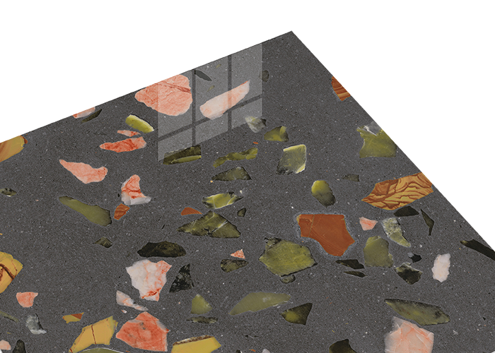 dBologna Portico, terinspirasi oleh kombinasi konsep teraso dengan fragmen batu berwarna cerah, kontras dengan latar belakangnya yang gelap. Koleksi ini dapat menjadi pilihan finishing lantai untuk menciptakan interior yang eksotis.