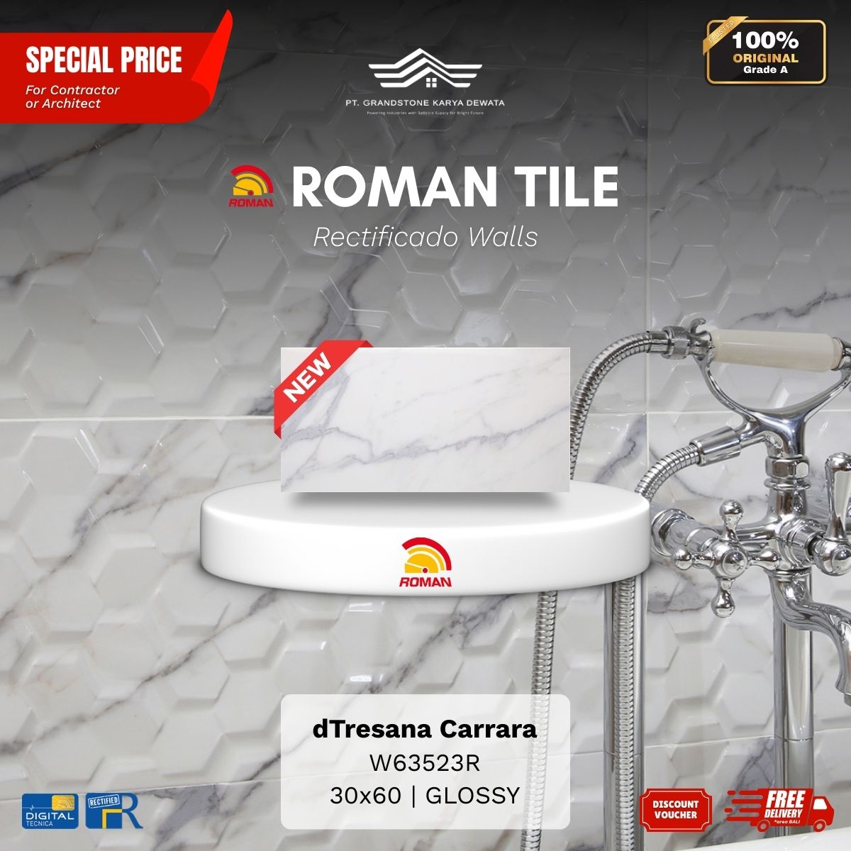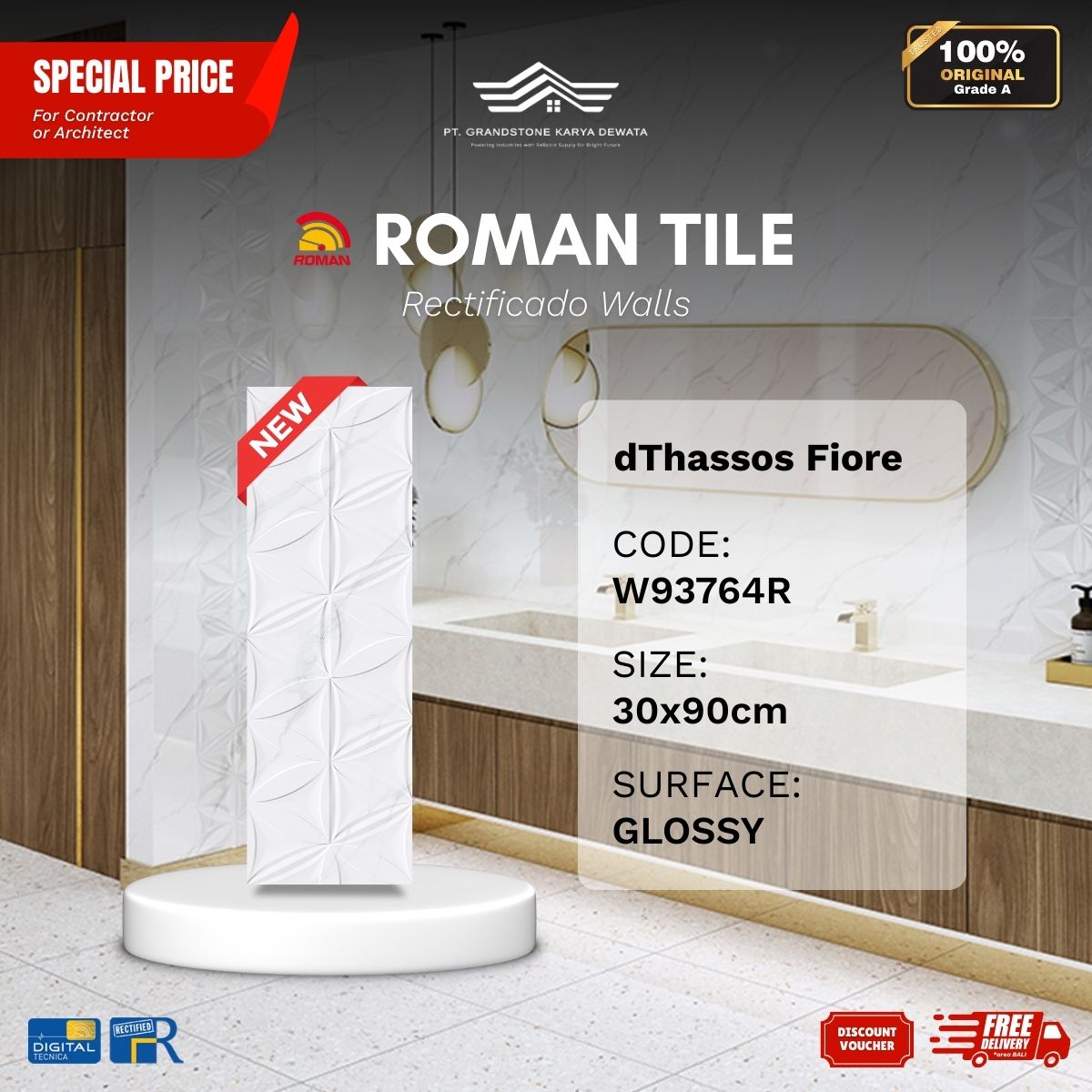 ![ROMAN RECTIFICADO WALL 1W93764R dThassos Fiore 30x90 [GRADE A] - Image 3](https://grandstone.id/wp-content/uploads/2025/12/RandomFaces_Roman_dThassos_Fiore_30x90R.jpg)
