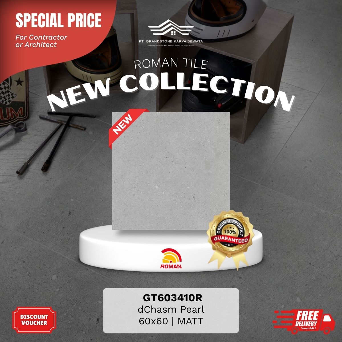 Produk unggulan Roman Granite Motif berkonsep bebatuan, lebih natural, tahan panas, tahan chemichal, tidak menyerap noda. Grandstone Karya Dewata siap menjadi mitra terbaik kamu untuk memilih motif sesuai keinginan, pembelian dengan harga kompetitif, hingga project pemasangan oleh aplikator andal dan berkualitas.