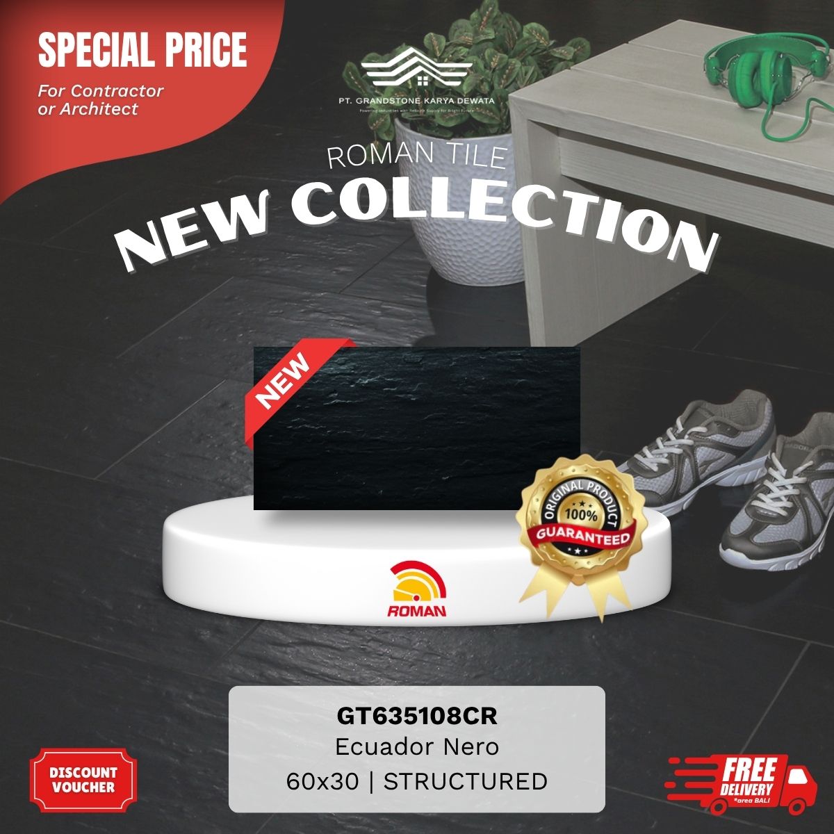 Produk unggulan Roman Granite Motif berkonsep bebatuan, lebih natural, tahan panas, tahan chemical, tidak menyerap noda. Grandstone Karya Dewata siap menjadi mitra terbaik kamu untuk memilih motif sesuai keinginan, pembelian dengan harga kompetitif, hingga project pemasangan oleh aplikator andal dan berkualitas.