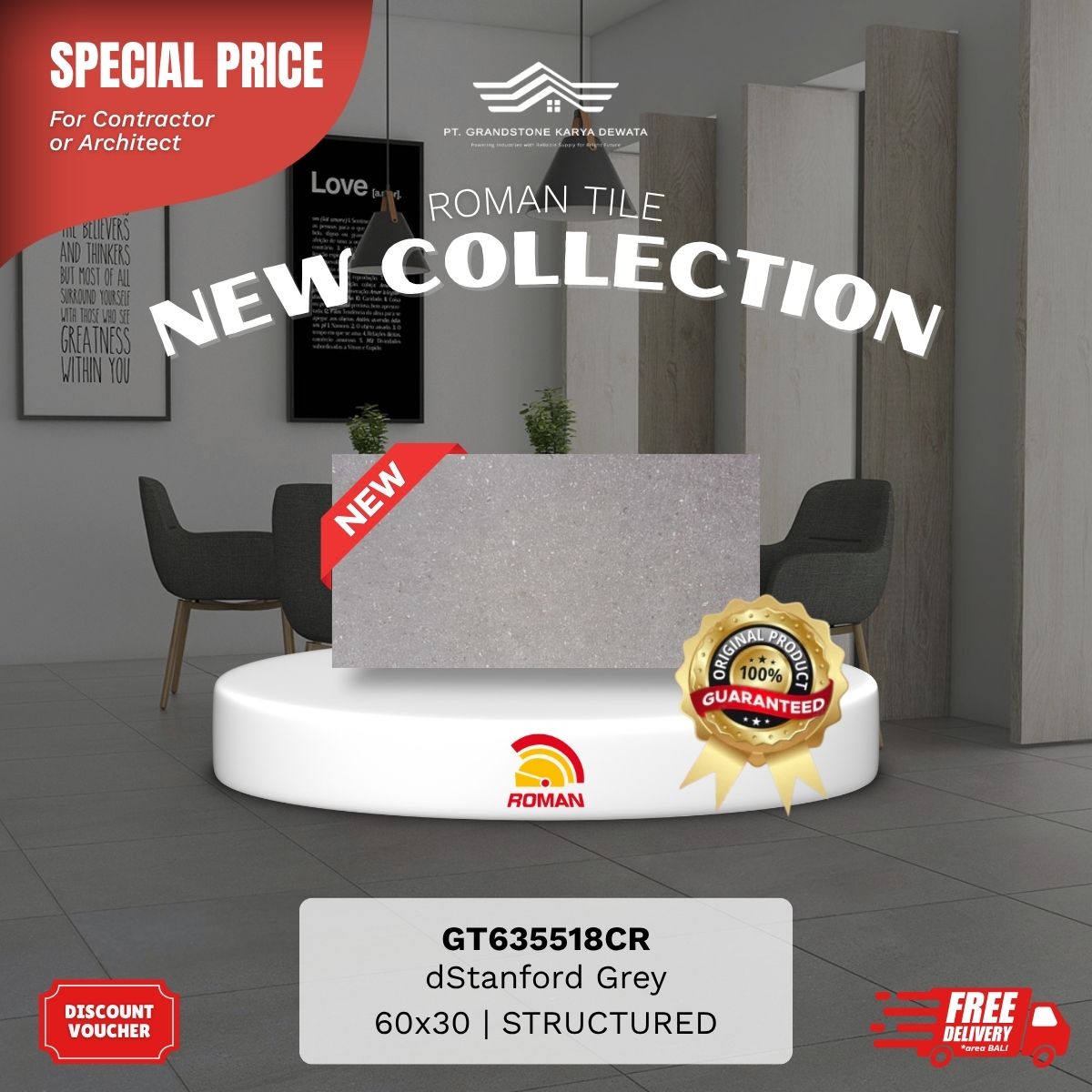 Produk unggulan Roman Granite Motif berkonsep bebatuan, lebih natural, tahan panas, tahan chemical, tidak menyerap noda. Grandstone Karya Dewata siap menjadi mitra terbaik kamu untuk memilih motif sesuai keinginan, pembelian dengan harga kompetitif, hingga project pemasangan oleh aplikator andal dan berkualitas.