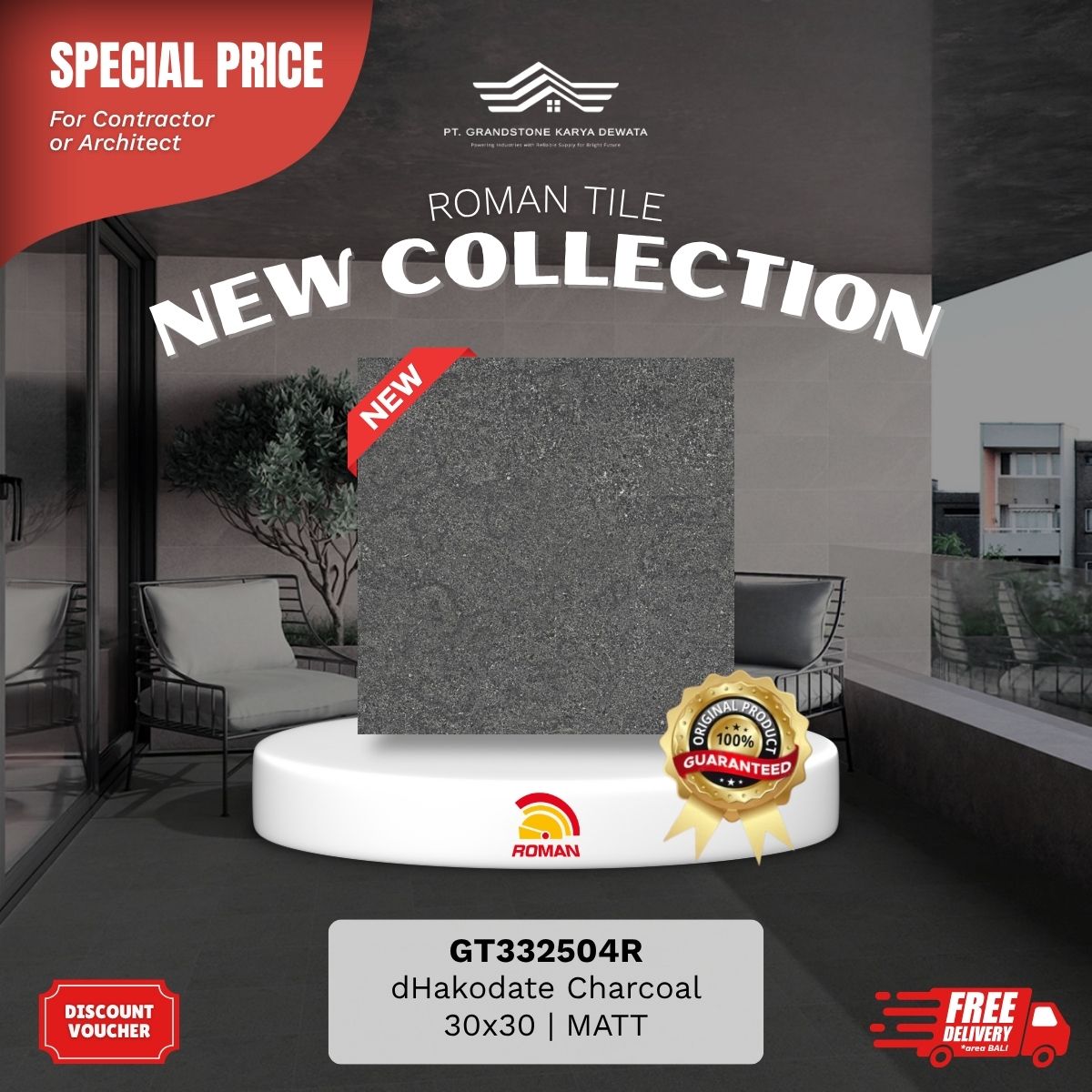 Produk unggulan Roman Granite Motif berkonsep bebatuan, lebih natural, tahan panas, tahan chemical, tidak menyerap noda. Grandstone Karya Dewata siap menjadi mitra terbaik kamu untuk memilih motif sesuai keinginan, pembelian dengan harga kompetitif, hingga project pemasangan oleh aplikator andal dan berkualitas.