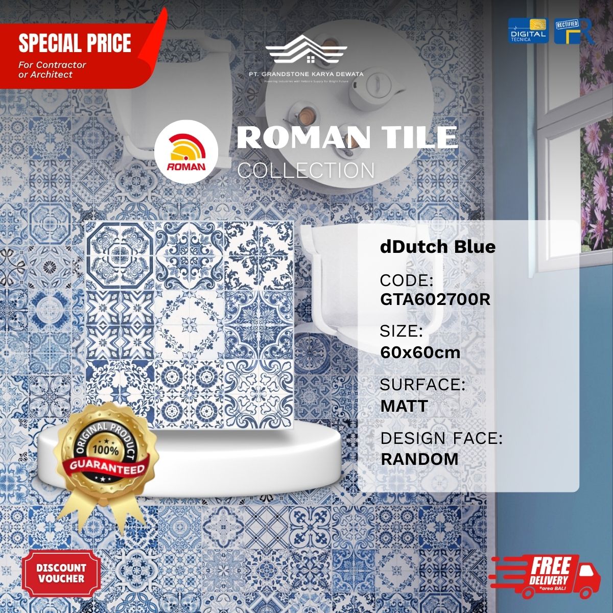 Ubin Belanda dulunya terkenal dengan motif ukiran dan warna biru kobaltnya yang memukau, digunakan sebagai dinding bangunan bagi kelas menengah ke atas untuk memberikan kesan kemewahan kontemporer modern. Berkat teknologi Digital Tecnica, desain ini menginspirasi lahirnya koleksi dDutch. Setiap ubin terdiri dari 9 jenis pola ubin yang disusun secara acak. Koleksi RomanGranite ini berisi 3 ubin dengan motif acak di setiap kotak (1,08 m²). dDutch adalah pilihan sempurna untuk konsep bangunan residensial maupun komersial yang ingin menciptakan kembali nuansa biru dengan desain klasik yang terinspirasi Belanda.