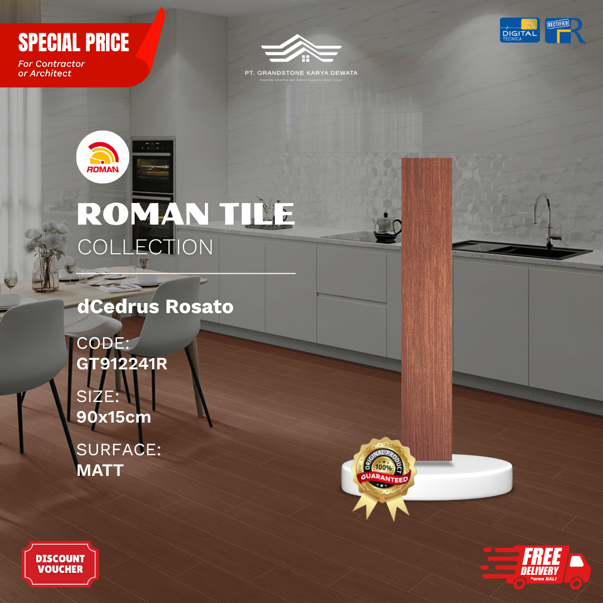 Produk unggulan Roman Granite Motif Kayu, lebih natural, tahan panas, tahan chemichal, tidak menyerap noda. Grandstone Karya Dewata siap menjadi mitra terbaik kamu untuk memilih motif sesuai keinginan, pembelian dengan harga kompetitif, hingga project pemasangan oleh aplikator andal dan berkualitas.
